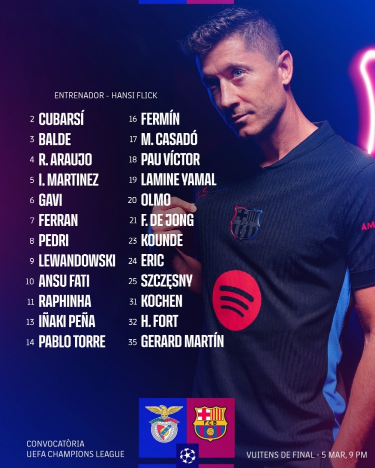 2025-03-04 19:59:45巴薩歐冠客戰(zhàn)本菲卡名單:萊萬(wàn)、亞馬爾、加維、奧爾莫在列