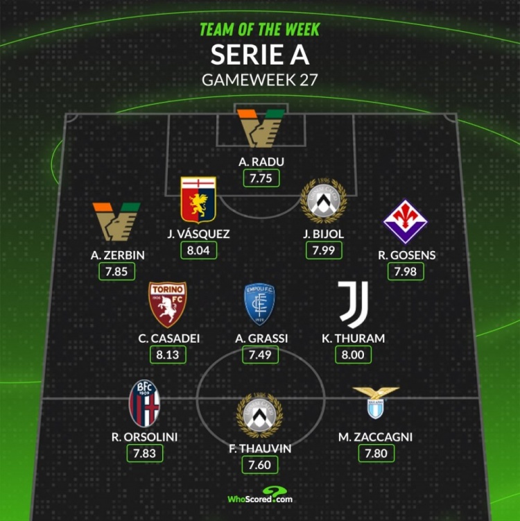 2025-03-04 20:00:25whoscored意甲本周最佳陣:K-圖拉姆&拉杜領銜 卡薩迪&戈森斯在列