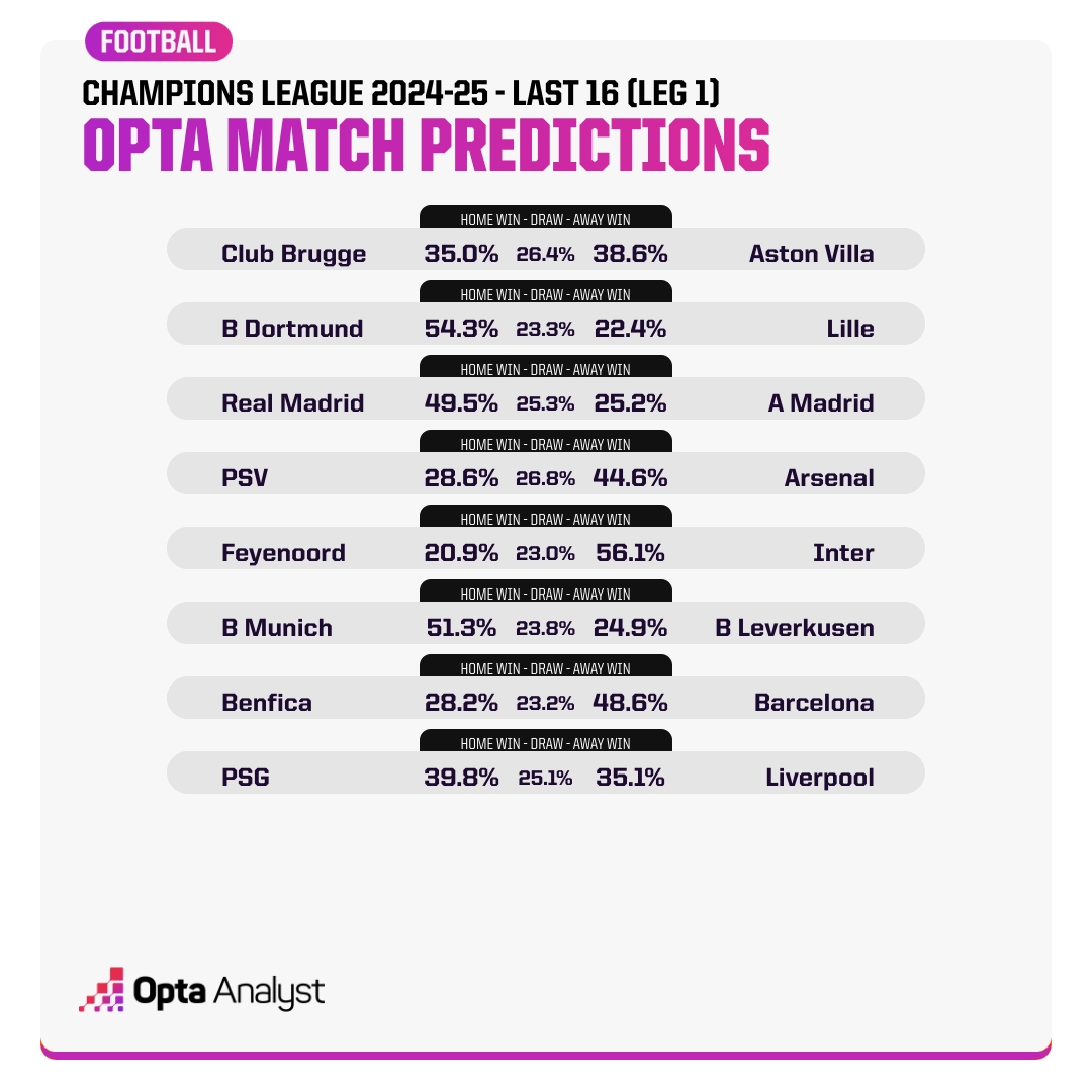 03月04日訊 數據機構Opta對歐冠16強賽首回合的比賽進行了勝負預測,8場對陣中,多特、皇馬、阿森納、國米、拜仁和巴薩最被看好首回合取勝。