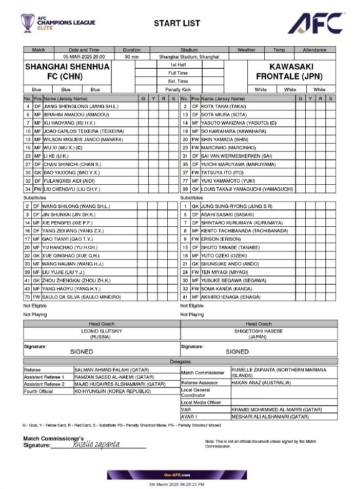 2025-03-05 19:45:37亞冠精英聯賽1/8決賽首回合 上海申花vs川崎前鋒首發名單 ???