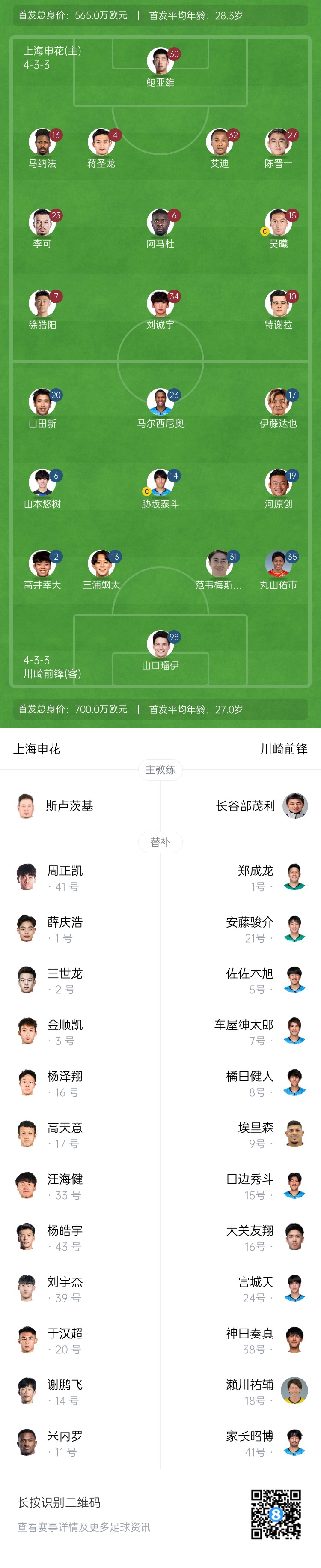 2025-03-05 19:45:37亞冠精英聯賽1/8決賽首回合 上海申花vs川崎前鋒首發名單 ???