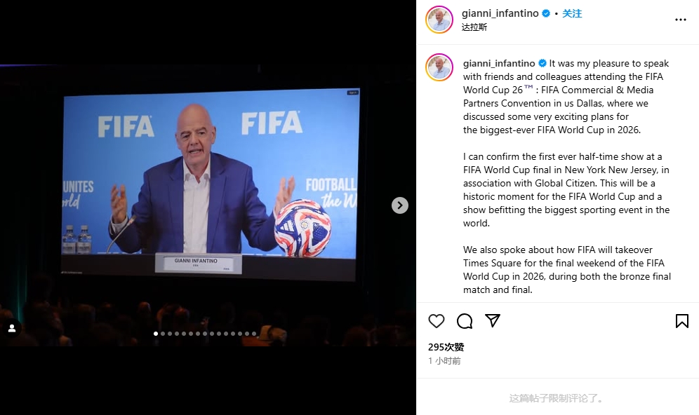 因凡蒂諾在自己的社媒中寫道:我可以確認,在新澤西舉行的2026年世界杯決賽上,將首次推出中場休息演出,FIFA將與Global Citizen合作。這會是FIFA世界杯的一個歷史性時刻。