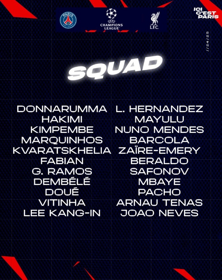 2025-03-05 19:47:17巴黎對陣利物浦大名單:登貝萊領(lǐng)銜鋒線,馬爾基尼奧斯坐鎮(zhèn)后防