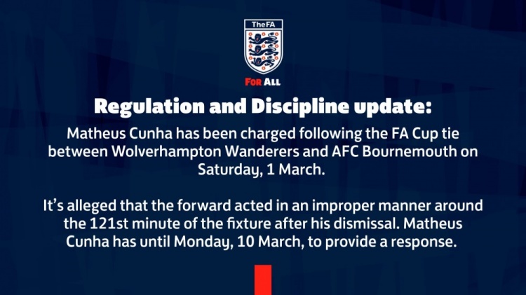 2025-03-06 19:32:10英足總官方:庫尼亞在足總杯被罰下后行為不當,對他提出指控