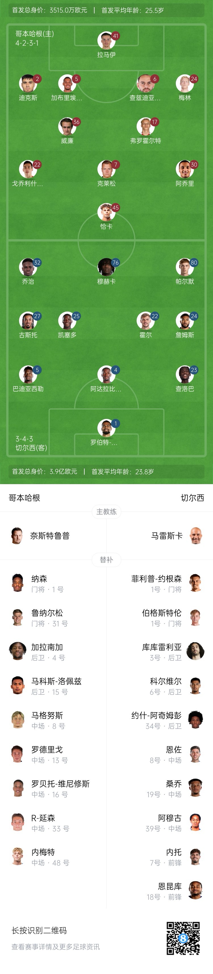 哥本哈根首發:41-拉馬伊、2-迪克斯、5-加布里埃爾、6-查茲迪亞科斯、24-梅林、36-威廉-克萊姆、17-弗羅霍爾特、22-戈喬利什維利、7-克萊松、30-阿喬里、45-恰卡
