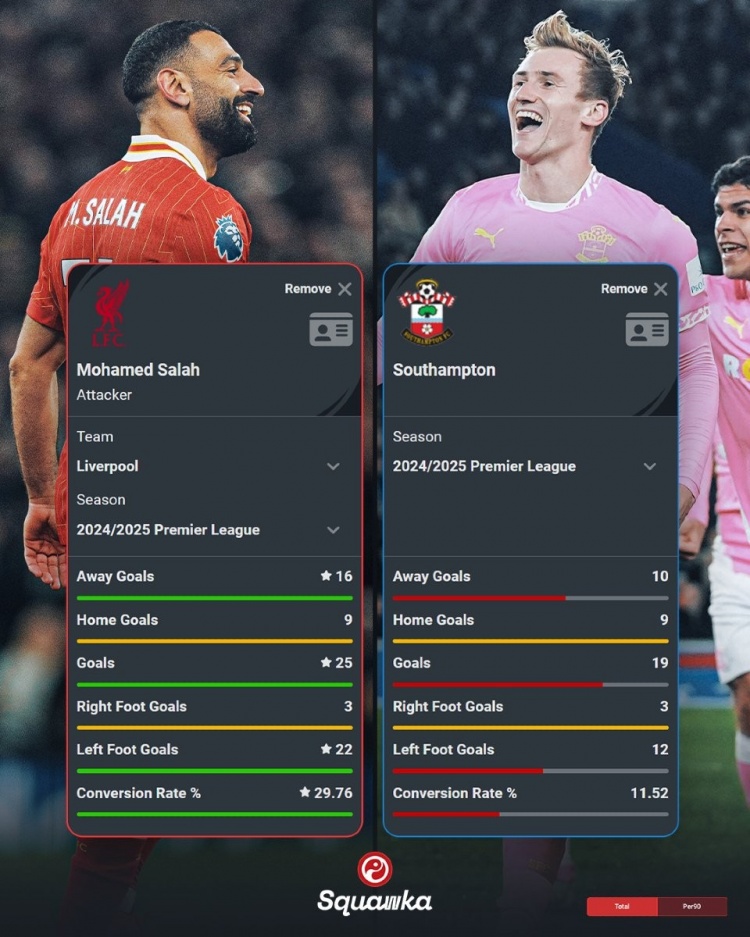 2025-03-07 23:18:46薩拉赫本賽季英超25球&轉化率29.76%,南安普頓同期19球&11.52%
