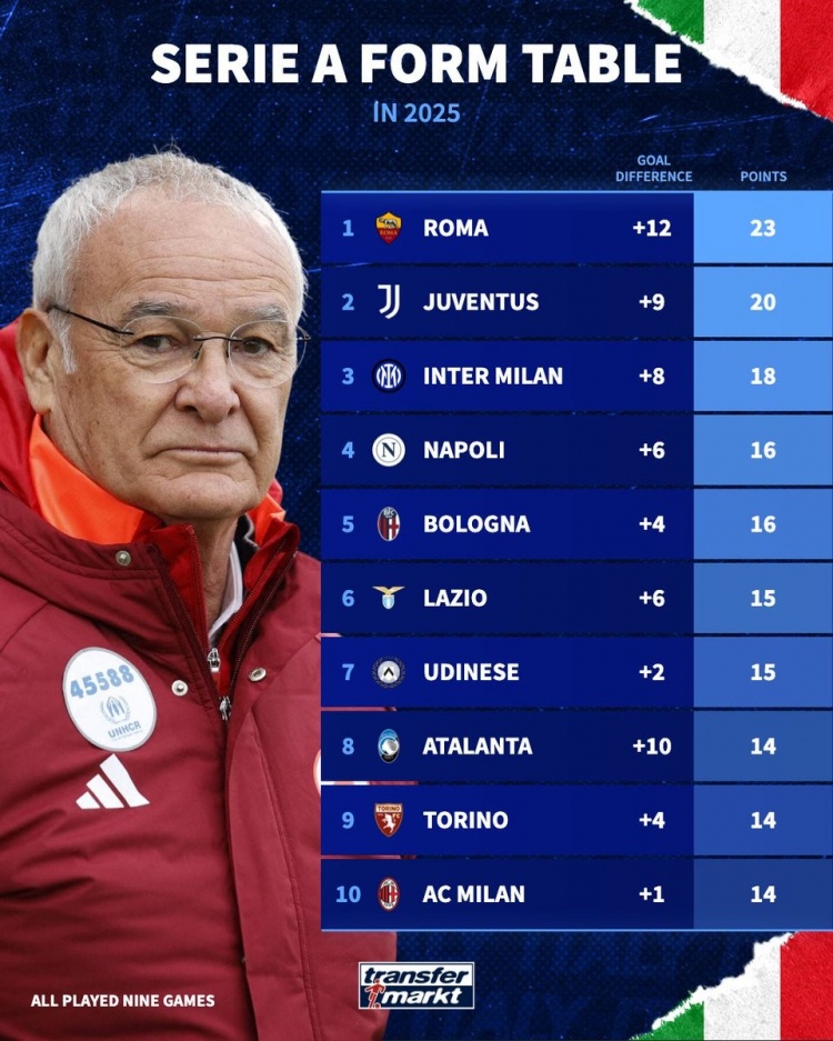 2025-03-07 23:19:22只手補天!2025意甲積分榜:羅馬23分居首,尤文20分、國米18分