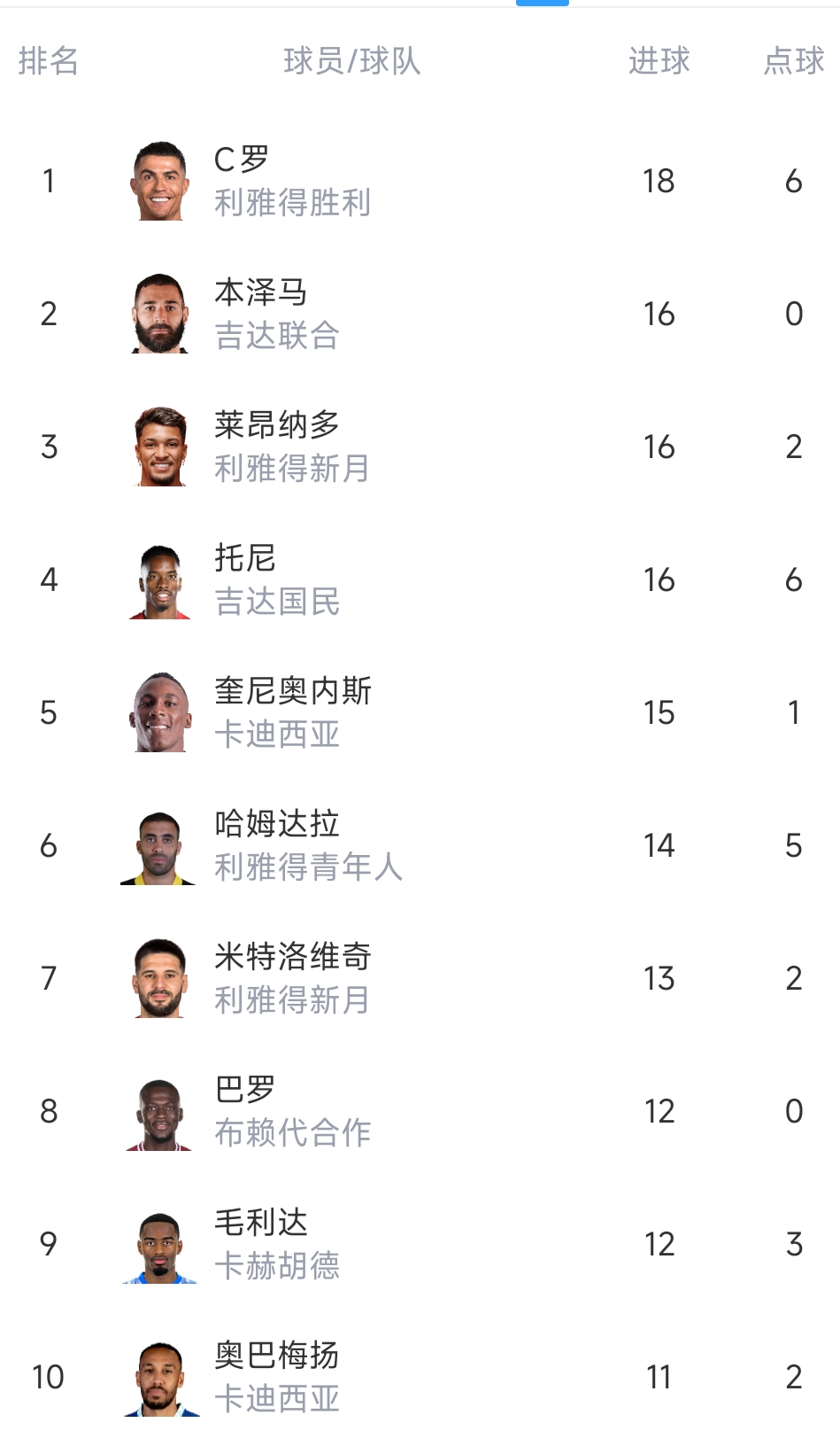 2025-03-08 09:13:57沙特聯射手榜:C羅18球領跑,本澤馬16球第二、奧巴梅揚11球第十