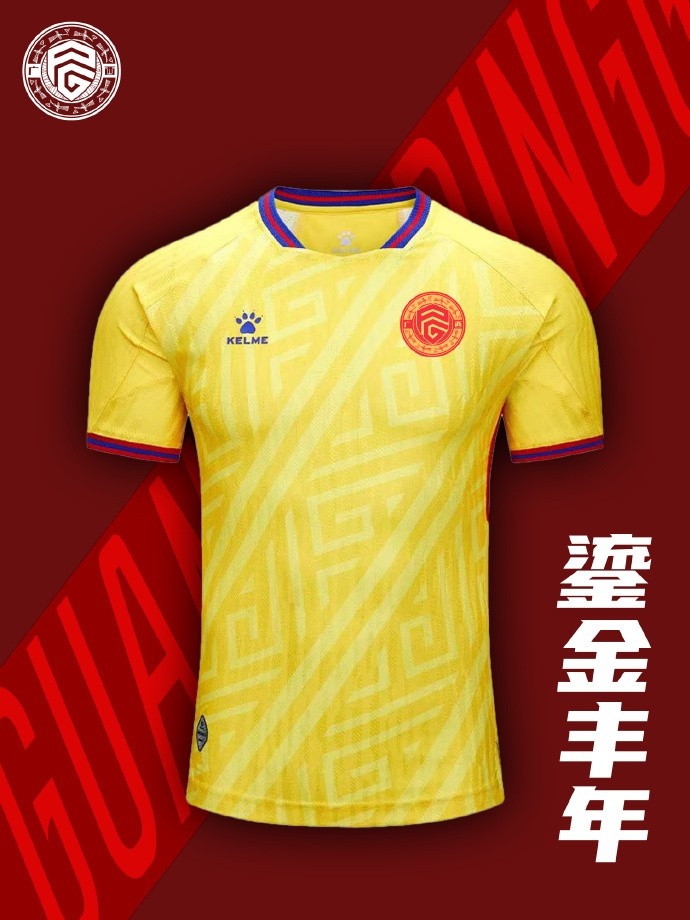 全新客場球衣以八桂大地的豐收盛景為靈感,采用通體金黃色設計,斜紋壯錦暗藏千年智慧,非遺藍染如右江碧波輕點袖間。黃色象征著豐收與希望,也預示著球隊在新賽季中將如金色閃電般迅捷,以靈活的戰術和精準的配合,在客場征戰中收獲勝利的果實。遠征之時,讓每一道褶皺都閃耀文明之光,每一道斜紋都仿佛在訴說著球隊堅韌不拔的精神,無論面對何種挑戰,都將勇往直前,勢不可擋!