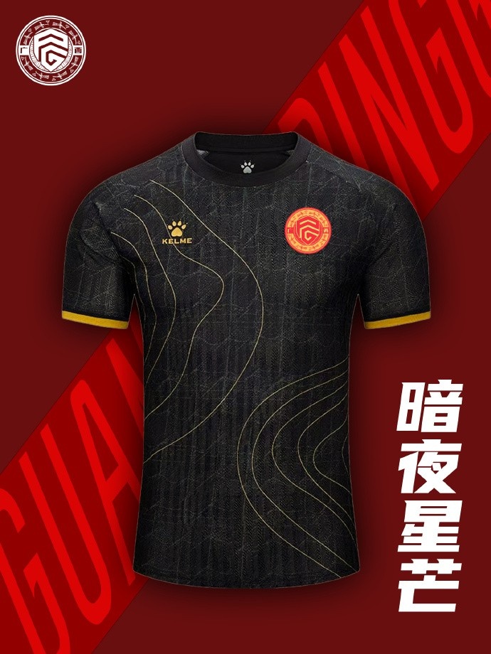 第二客場球衣源自廣西黑衣壯的族群標記,黑色代表著力量與神秘,亦預示著球隊在新賽季中將如黑夜中的捕手,以冷靜的頭腦和堅強的意志,在關鍵時刻給予對手致命一擊。胸前的金色線條既是喀斯特奇峰的暗號,亦是龍脊梯田優美曲線的化身,暗色底紋如球網交織,象征著球隊在纏斗中迸發出無窮的力量,無論何時何地,都將以奮力一搏的姿態奪取最終的勝利!