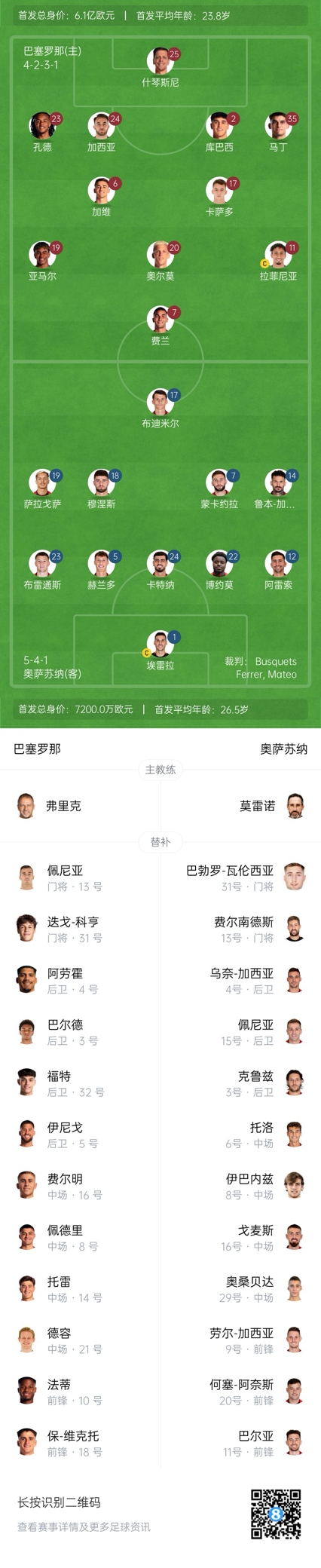 巴薩首發:25-什琴斯尼、24-埃里克-加西亞、2-庫巴西、35-杰拉德-馬丁、23-孔德、6-加維、17-卡薩多、11-拉菲尼亞、19-亞馬爾、20-奧爾莫、7-費蘭