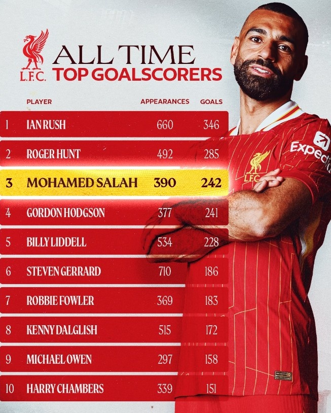 2025-03-09 03:38:37242球!薩拉赫躋身利物浦隊史射手榜第三位,僅次于拉什、亨特