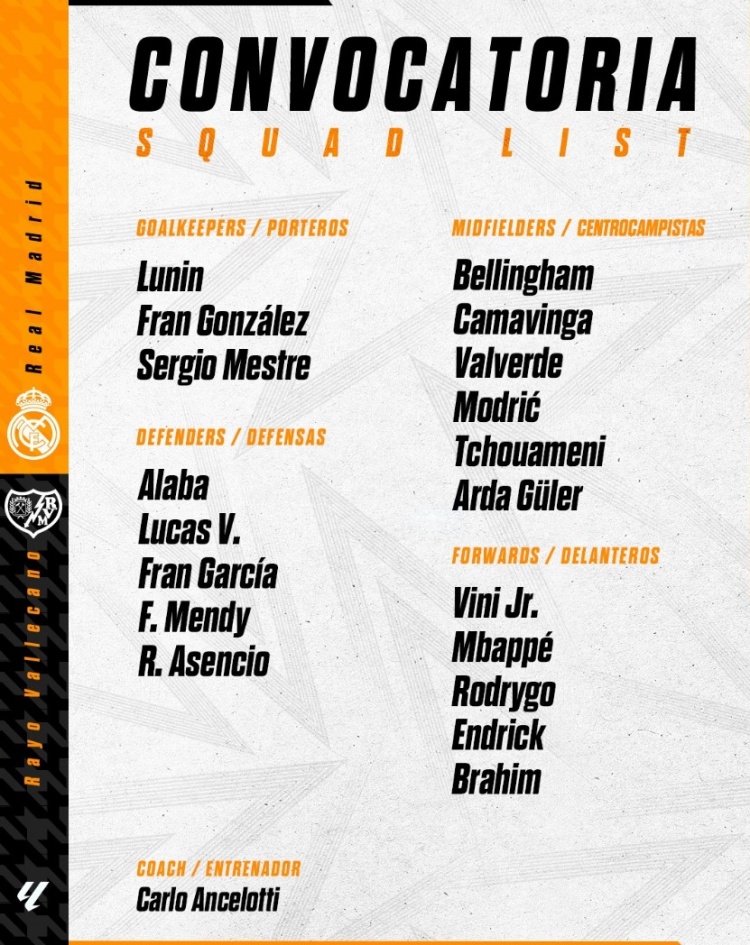 2025-03-09 22:06:33皇馬對陣巴列卡諾大名單:庫爾圖瓦缺席,姆巴佩&巴爾韋德在列