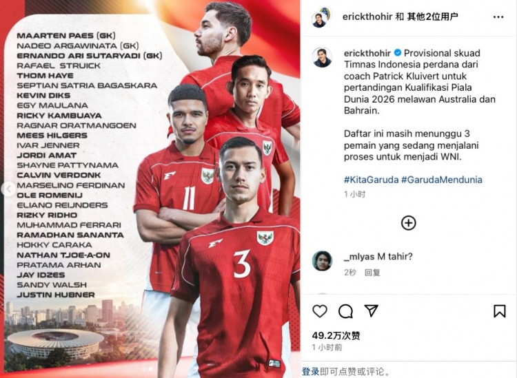 3月9日訊 今日,印尼足協主席托希爾更新社媒,曬出了印尼國家隊3月份18強賽大名單,迪克斯、伊澤斯、哈耶、帕斯、小賴因德斯、費爾東克等歸化球員悉數入選。
