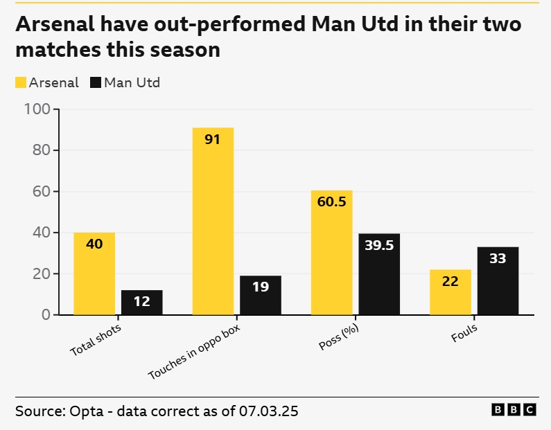 2025-03-09 22:13:08一邊倒?BBC:阿森納本賽季兩次交手曼聯(lián),多項(xiàng)關(guān)鍵數(shù)據(jù)占優(yōu)