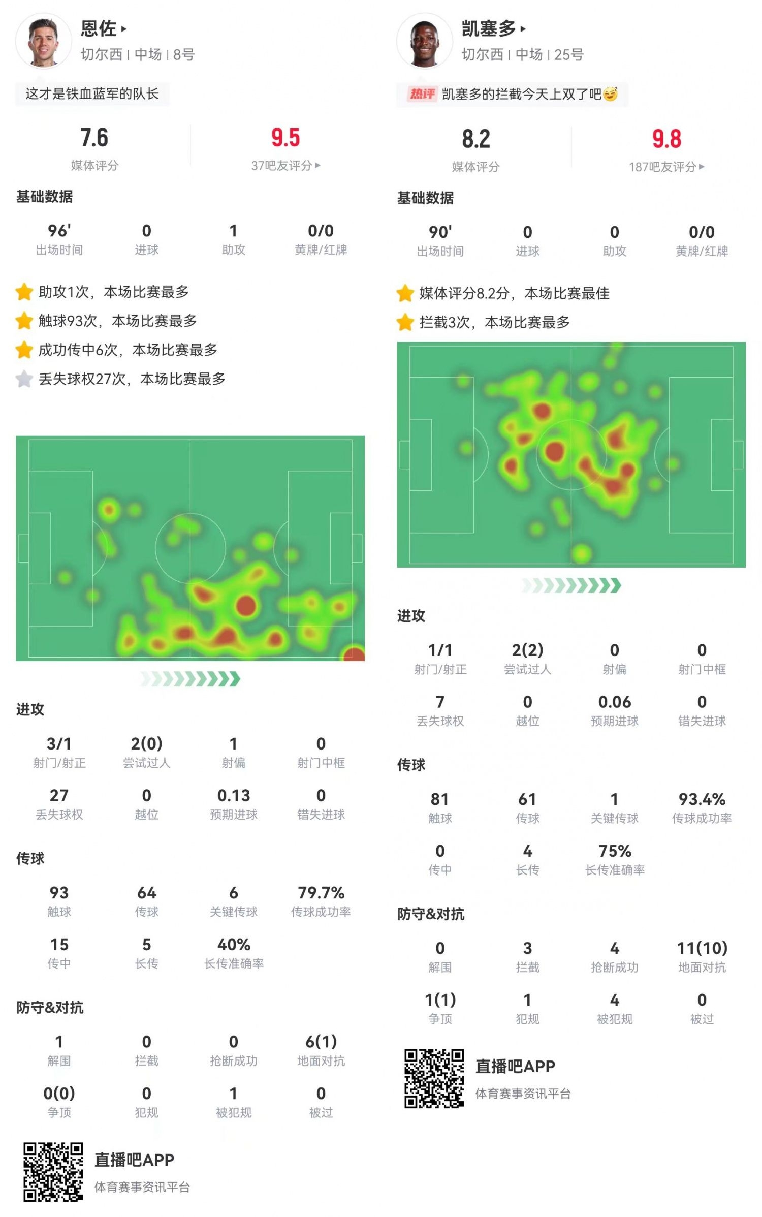 本場比賽恩佐與凱塞多的發揮可圈可點。“嘗試助攻王”恩佐總算“撿”到一個助攻,庫庫雷利亞的制勝球便是由恩佐傳導。凱塞多則繼續自己的戰神級發揮,本場比賽貢獻12次對抗11次成功,還有3攔截4搶斷0被過的鐵閘表現。切爾西的雙腰進可攻退可守,正是藍軍本賽季戰績不錯的原因之一。