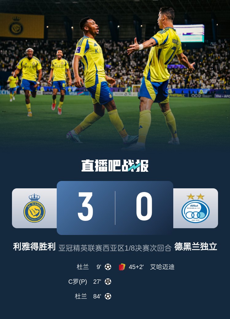 亞冠精英聯(lián)賽西亞區(qū)1/8決賽次回合,C羅進(jìn)球,杜蘭梅開(kāi)二度,利雅得勝利3-0德黑蘭獨(dú)立,晉級(jí)亞冠八強(qiáng)。